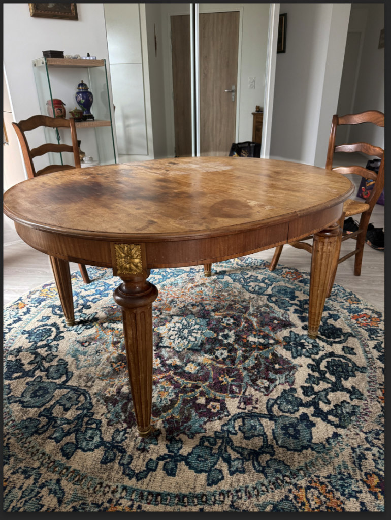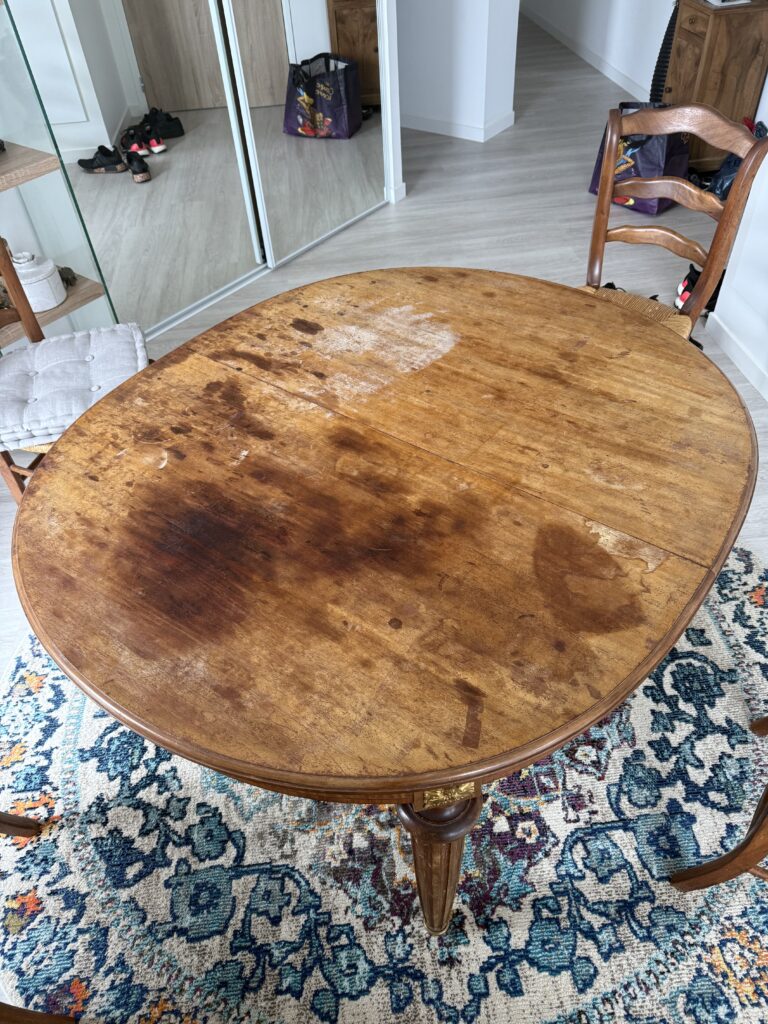Cette table de salle à manger était dans un très mauvais état. Taches de brûlure, vernis défraîchi, décoloration… Elle nécessitait une restauration de toute urgence !