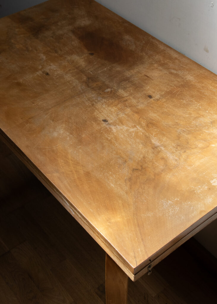 Le vernis de cette table porte-feuille a besoin d’une restauration, il est complètement abîmé : rayures, tâches, les motifs du bois n’est même plus visibles.