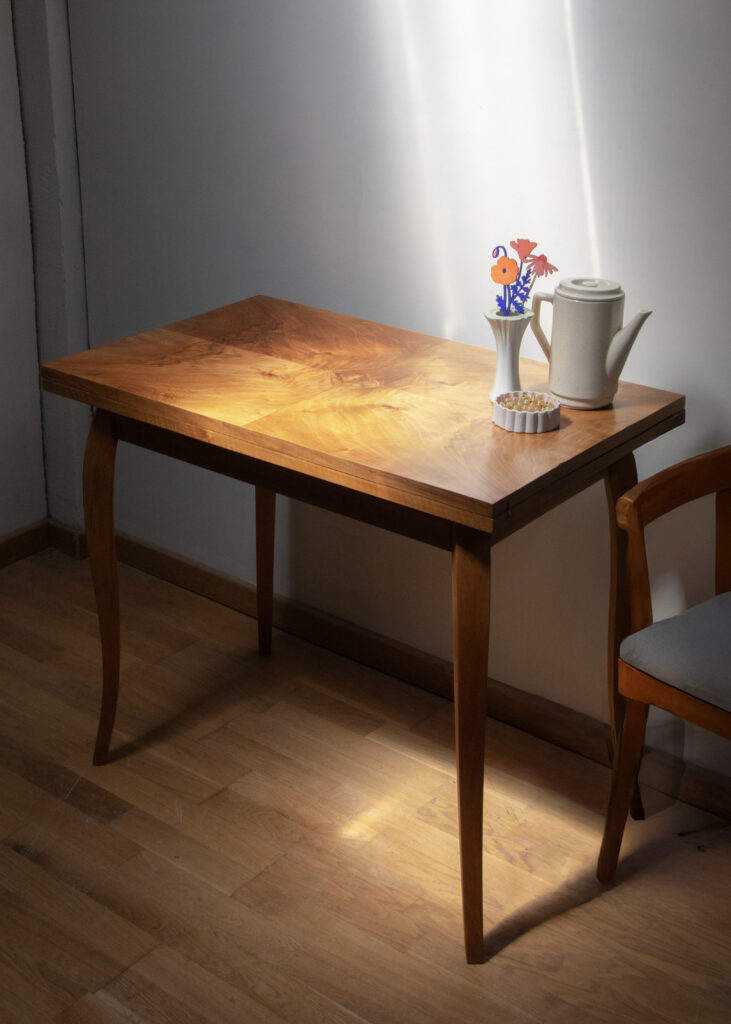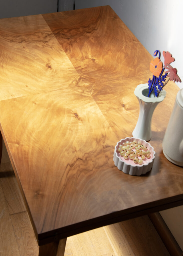 Je l’ai dans un premier temps décapée. Puis poncée à la main très légèrement puisque le plateau est recouvert d’un placage en noyer très fin. J’ai ensuite utilisé du fondur pour boucher les pores du bois et de la cire pour protéger.