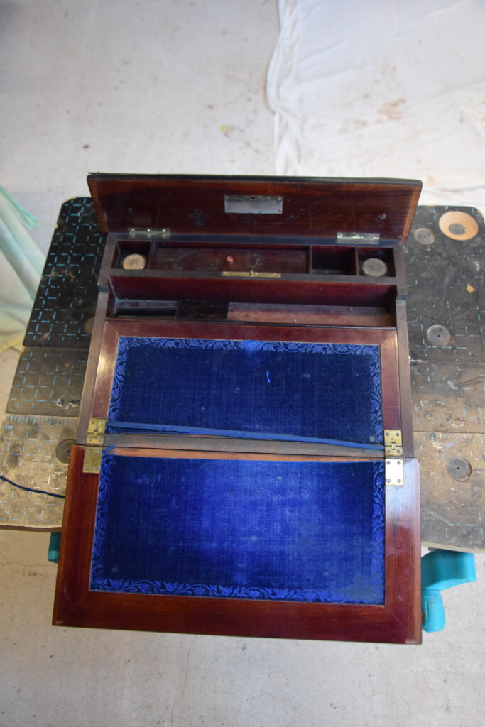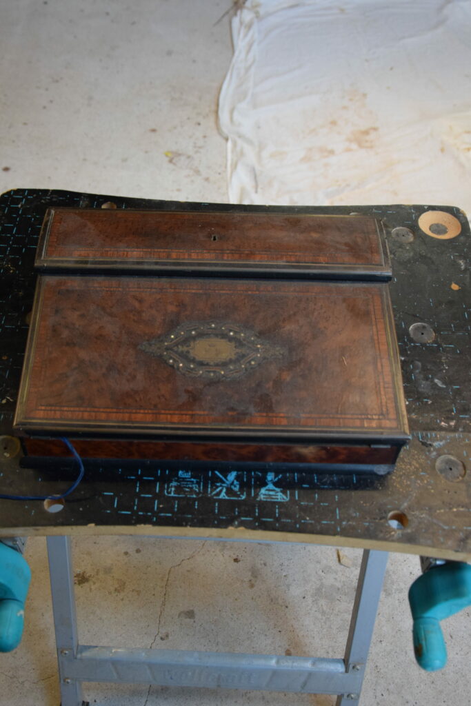 La première étape dans la restauration de cet écritoire est de démonter les différents éléments et de retirer l’ancienne finition. Celle-ci n’est plus viable : ternie, encrassée, craquelée et rayée par endroits. Avec un chiffon d’alcool et en ponçant avec un grain très fin, j’ai pu retirer l’ancien vernis au tampon. Comme on peut le voir sur la photo 2, le vernis au tampon permet d’obtenir une brillance et un éclat particulier. Le vernis au tampon ou « vernis gomme laque » est d’origine naturelle, les ébéniste le pratique depuis le début du XVIIIeme siècle.