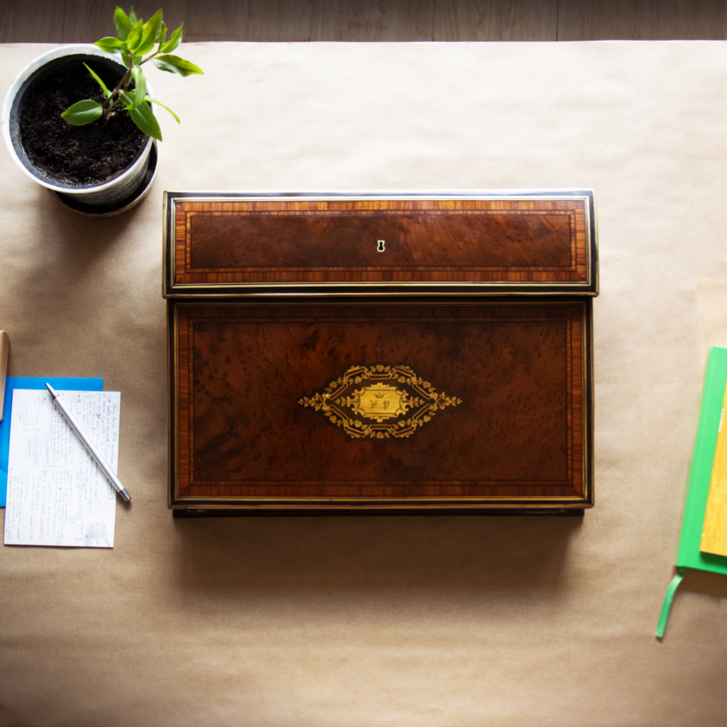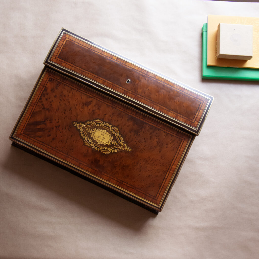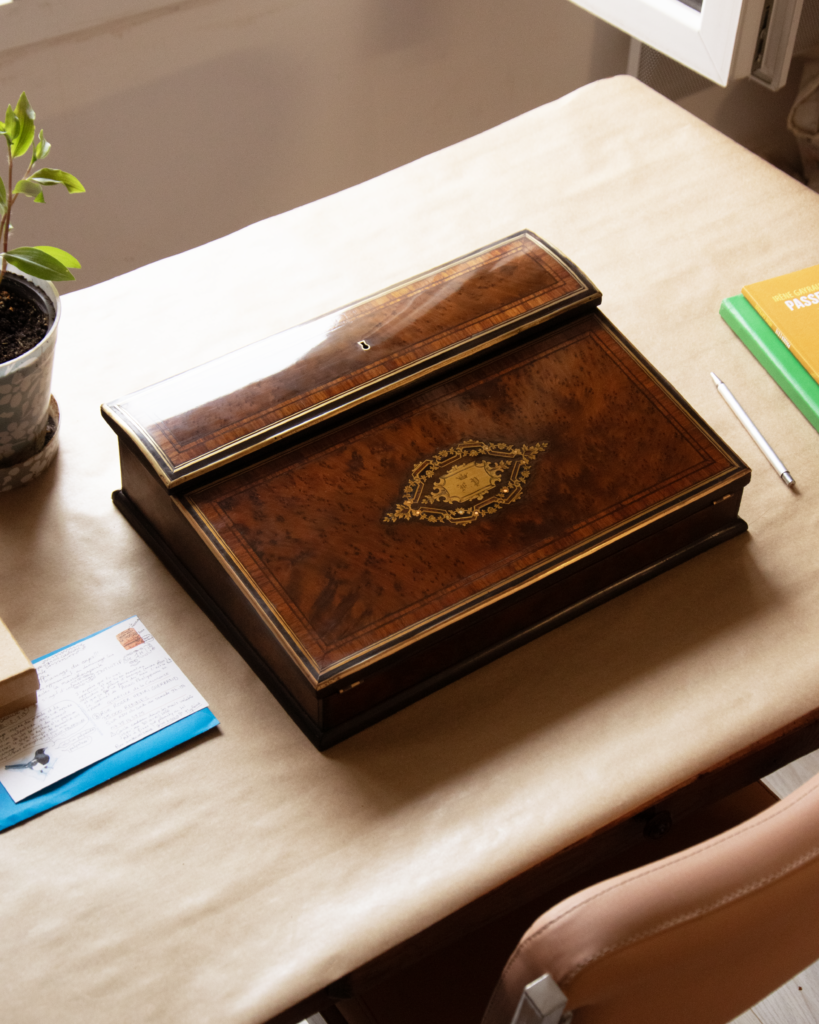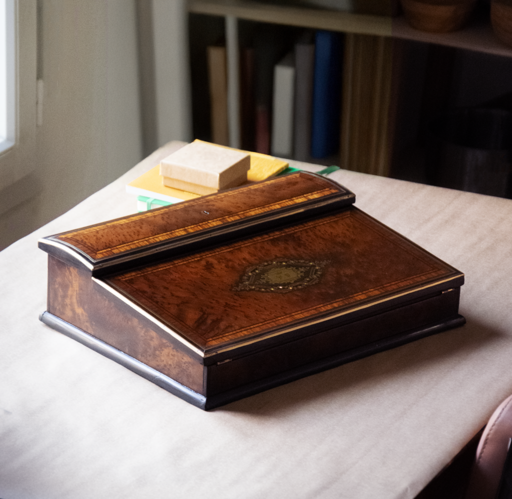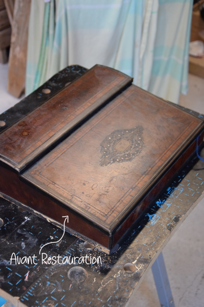 Cet écritoire date de la fin du 19eme siècle, époque dite « Napoléon III ». Il est constitué de loupe d’acajou, d’ébène et de palissandre. C’est un très bel ouvrage qui permet de conserver ses lettres, plumes et encriers. Après plus d’un siècle, il était dans un très mauvais état, et méritait d’être remis à neuf.